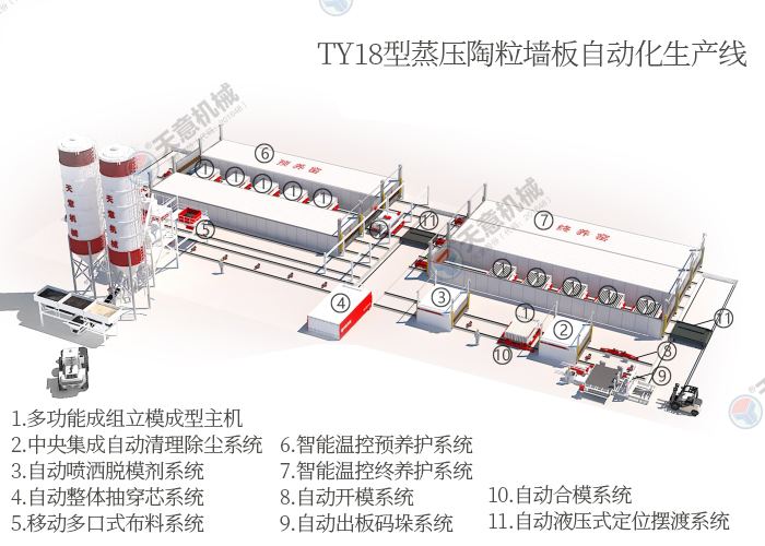 近年來,混凝土空心墻板發展迅速,究其原因是其原材料水泥和粗細骨料易于購買,生產效率高能夠實現半機械化或者機械化生產等因素。其中陶?;炷翍糜谳p質隔墻板中,能夠進一步提高輕質隔墻板的性能,因此在天意機械的客戶中生產陶粒墻板的客戶也是越來越多,下面主要為大家介紹一下陶?;炷翂Π宓呐浞奖壤皦Π鍣C生產工藝。